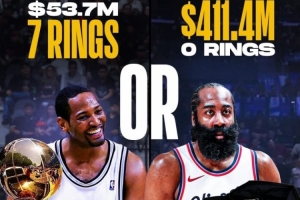 詹姆斯-哈登的(薪资)收入已经超过了4.11亿美元,但NBA生涯至今冠军数仍是0。